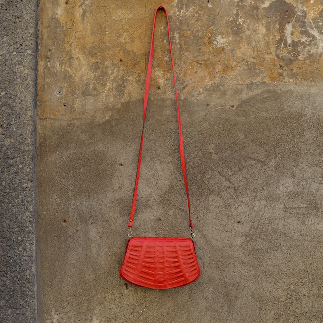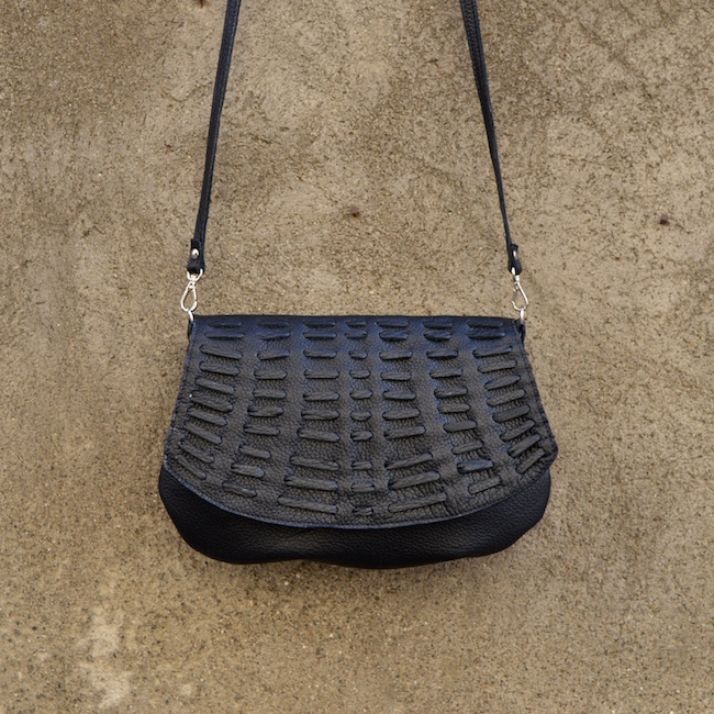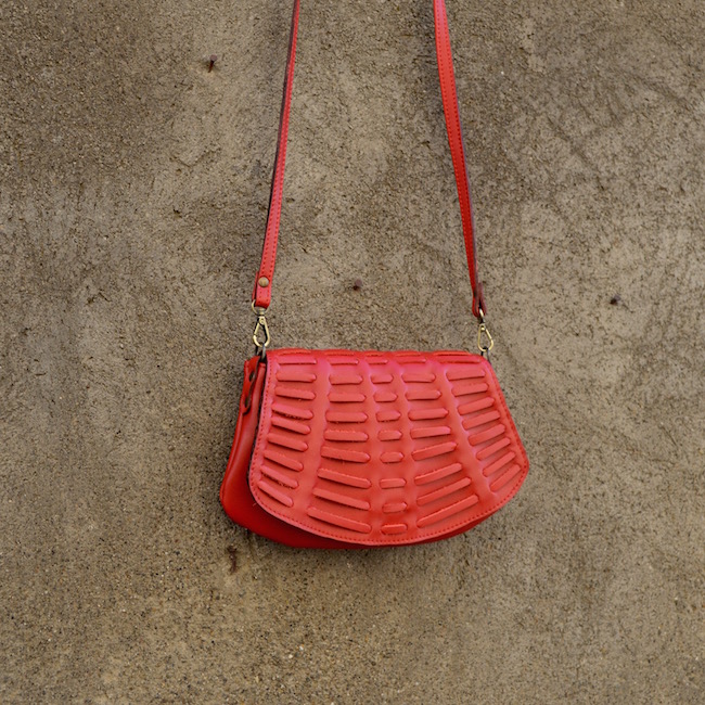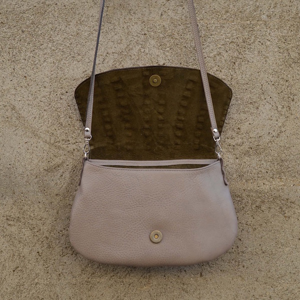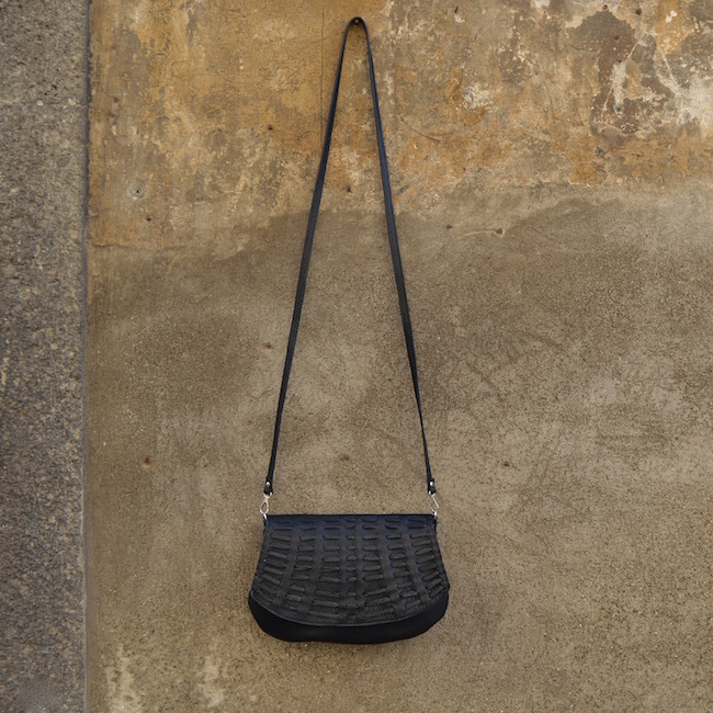 Borsa Unità has a unique latticed leather flap, which makes it both whimsical and refined. The purse fastens with a magnetic closure. The purse has a suede zippered pocket. The strap measures 120 cm and fastens to the purse with metal clips, allowing the purse to transform into a clutch. The purse fits a small journal or book, wallet, cell phone, and other small sized essentials.