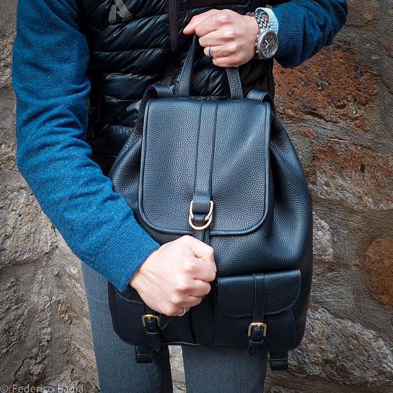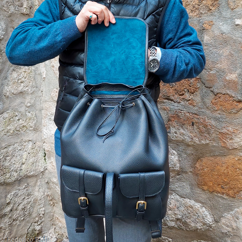 The Roma Backpack is both elegant and versatile. This spacious backpack secures with an internal drawstring closure and a sliding ring outer closure. Externally, two small buckled pockets make keeping essentials close easy. Inside, the backpack features a zipped pocket and a small slip pocket for safekeeping little or valuable items. It easily fits a 13 inch laptop. All hardware is solid brass.